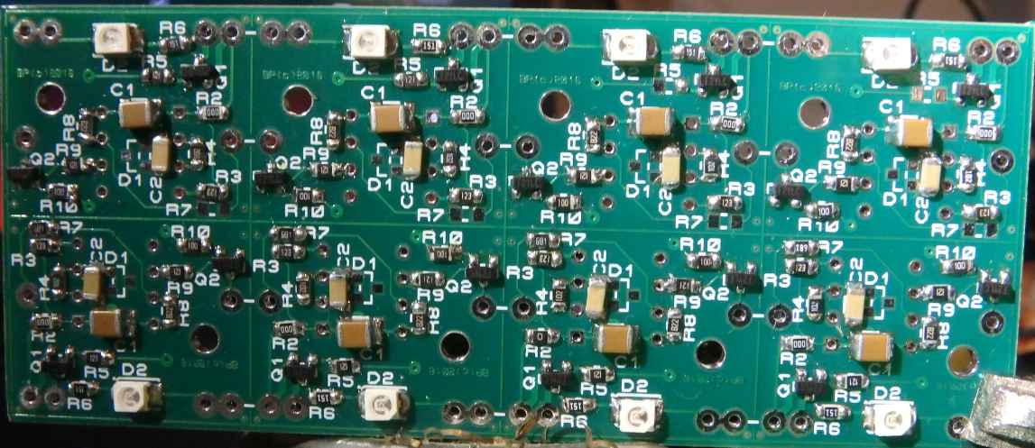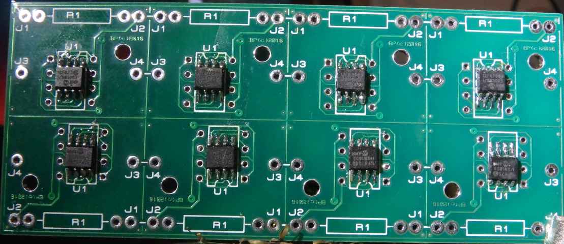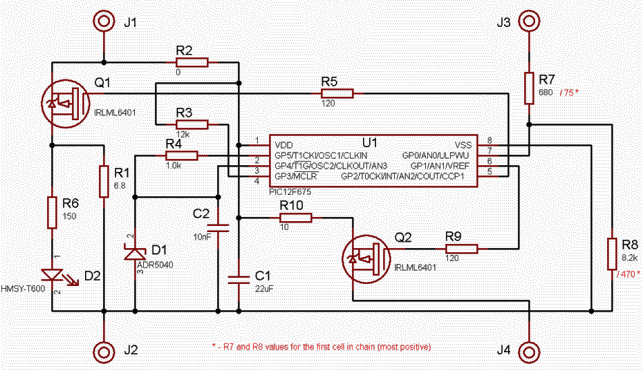 Note: The first cell in the chain has smaller resistors R7 (75 Ohms) and R8 (470 Ohms) and is connected to central module via optocoupler in such way that the emitter of the optocoupler is connected to J3 and the collector is connected to pin J1.